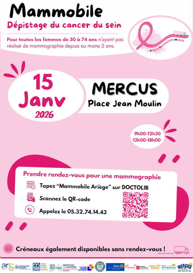 L’Association Ariège Prévention Mobile sera présente sur notre Commune avec la Mammobile le 15 Janvier Place Jean Moulin.